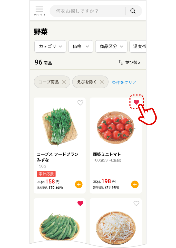商品の右上や下にある「♡(ハートマーク)」を押すと、お気に入りに登録されます。色がつくと登録完了のサインです。