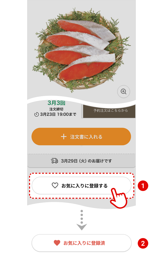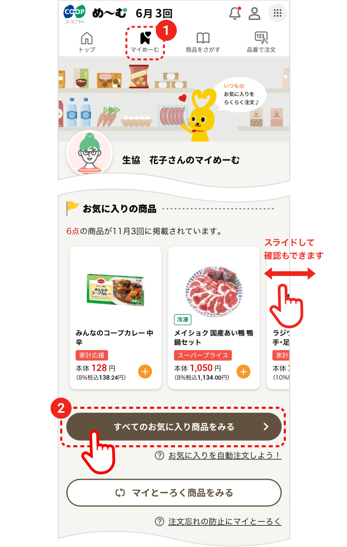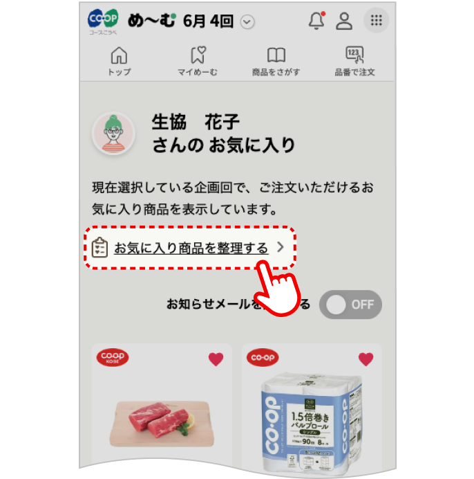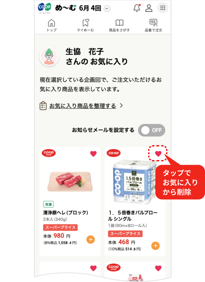 登録するとマイめーむにご選択中の企画回で注文できる「お気に入り商品」が表示されます。