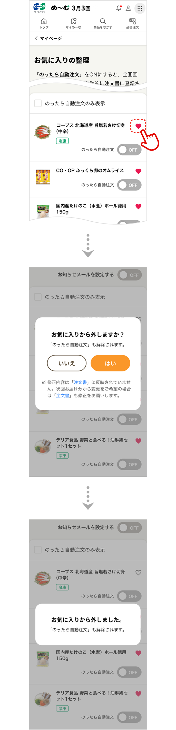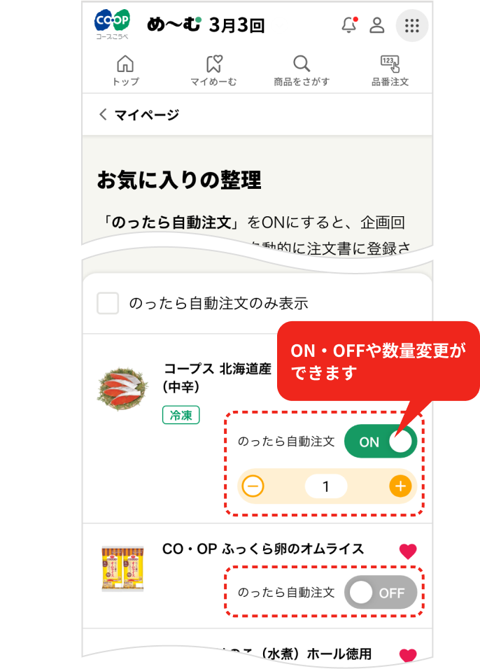 お気に入りの整理ページでは、お気に入り登録した商品や「のったら自動注文」に設定可能な商品を一覧で確認できます。