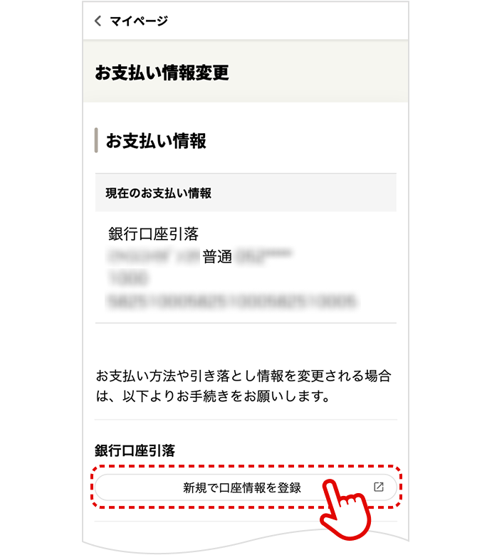 「新規で口座情報を登録」をタップクリックします。外部サイトにて新規の口座情報を登録できます。