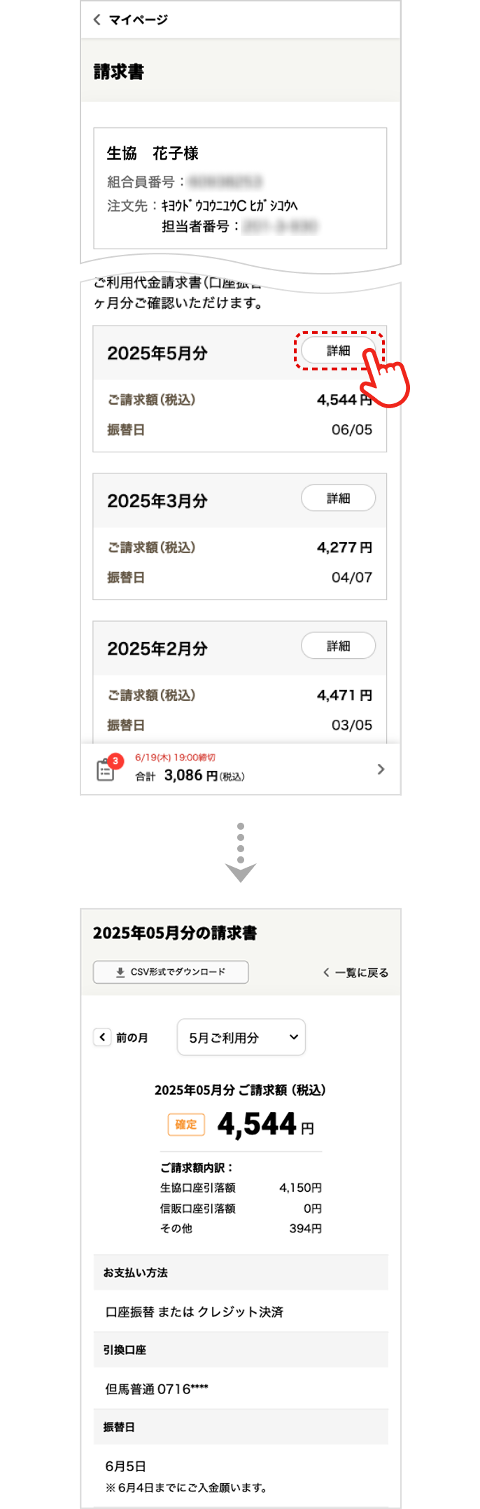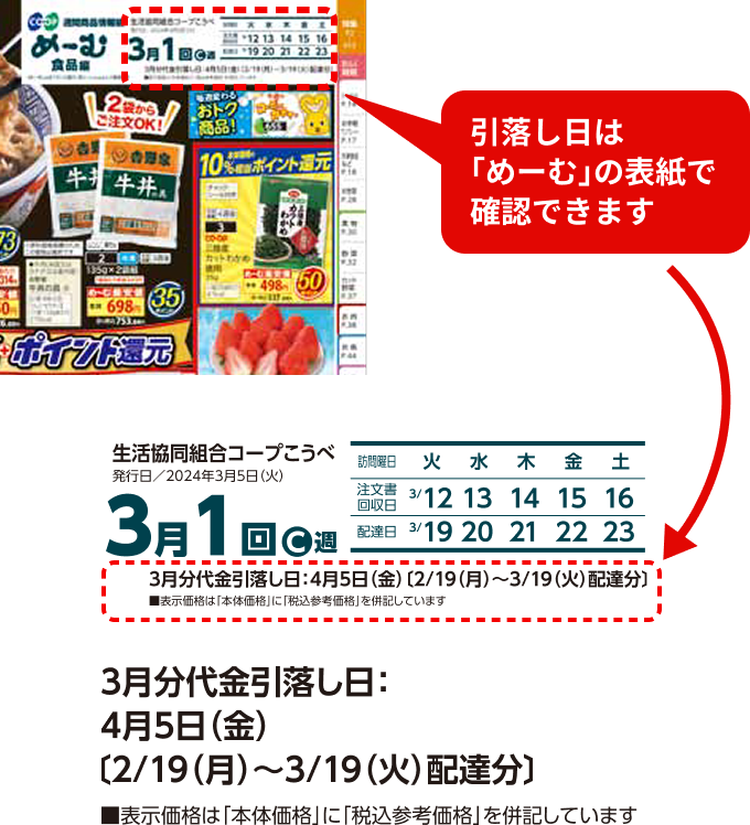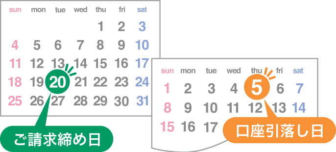 お届けした商品・サービスの1カ月分のご利用代金を、翌月5日にご指定の口座からの引落しとさせていただきます。