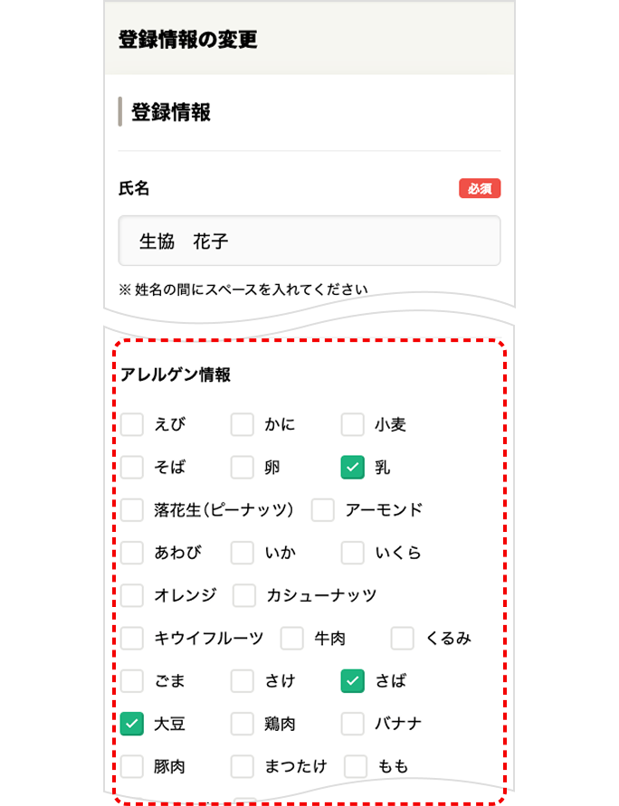 アレルゲン情報の項目がありますので、当てはまるアレルゲンにチェックを付けてください。