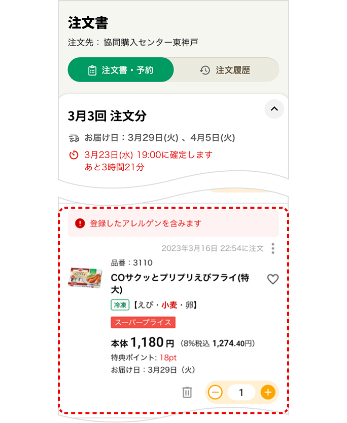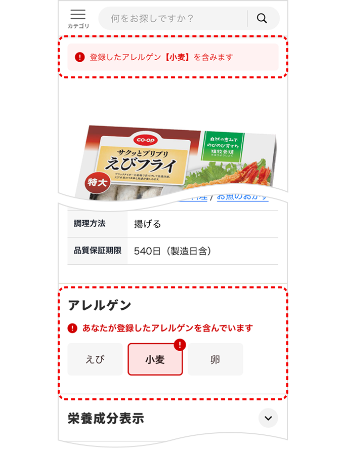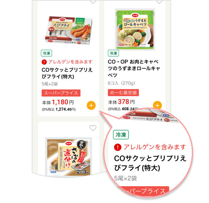 ご家族やご自分のアレルゲンを設定しておくと、該当商品に文言や「マーク」でお知らせします。