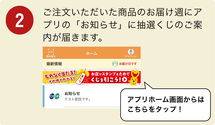 抽選くじ画面へはアプリの「お知らせ」のご案内からアクセスできます。