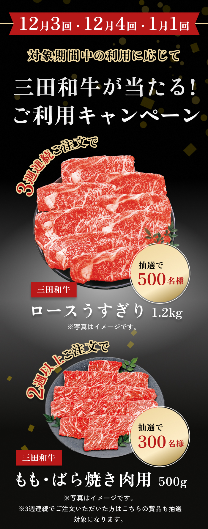 2週以上かつ1回につき本体価格合計700円以上ご注文いただいた方から抽選で三田和牛をプレゼントします!